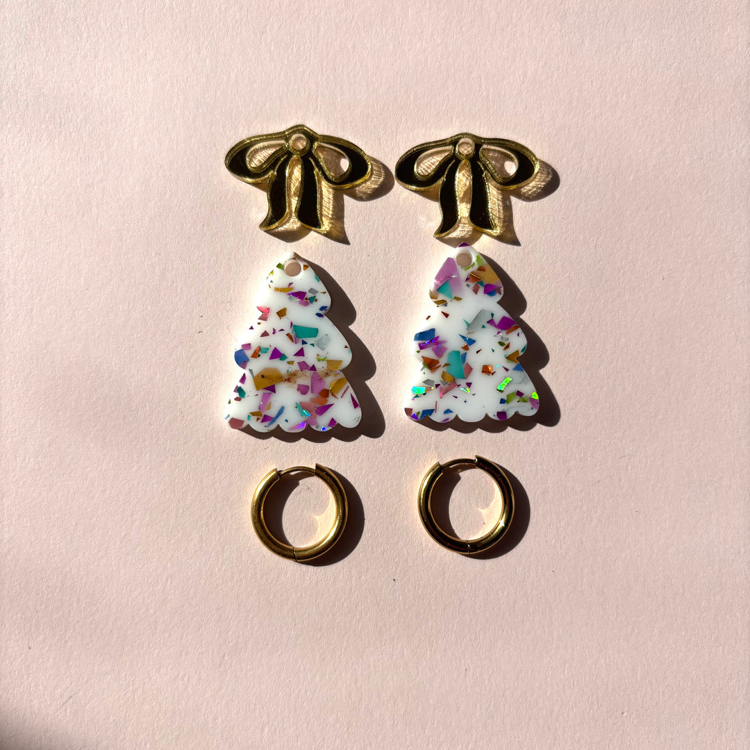 Puffy WHITE Christmas Tree Earrings with GOLD bow