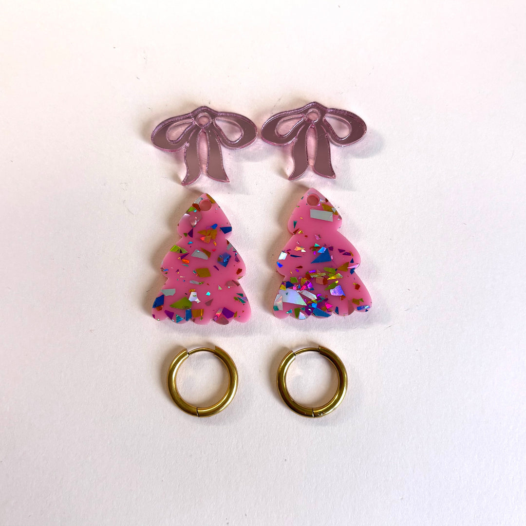 Puffy PINK Christmas Tree Earrings - with PINK bow